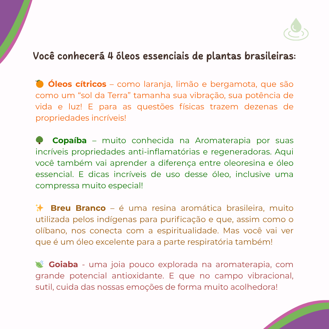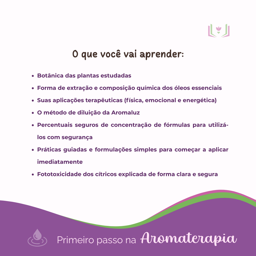 Primeiro Passo na Aromaterapia é um curso que apresenta plantas e óleos essenciais brasileiros com a metodologia de uma escola, a Aromaluz, com 20 anos de estudo e ensino em Aromaterapia. Nossa proposta é oferecer um curso onde você irá aprender Aromaterapia com profundidade, de forma responsável, consciente e prática.